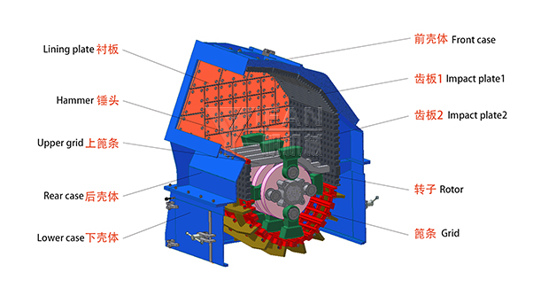 在傳統錘破基礎上,增加上篦條結構,避免大塊物料直接沖擊轉子,從而保護轉子,與傳統錘破相比,具有破碎比更大,產量更高等特點。